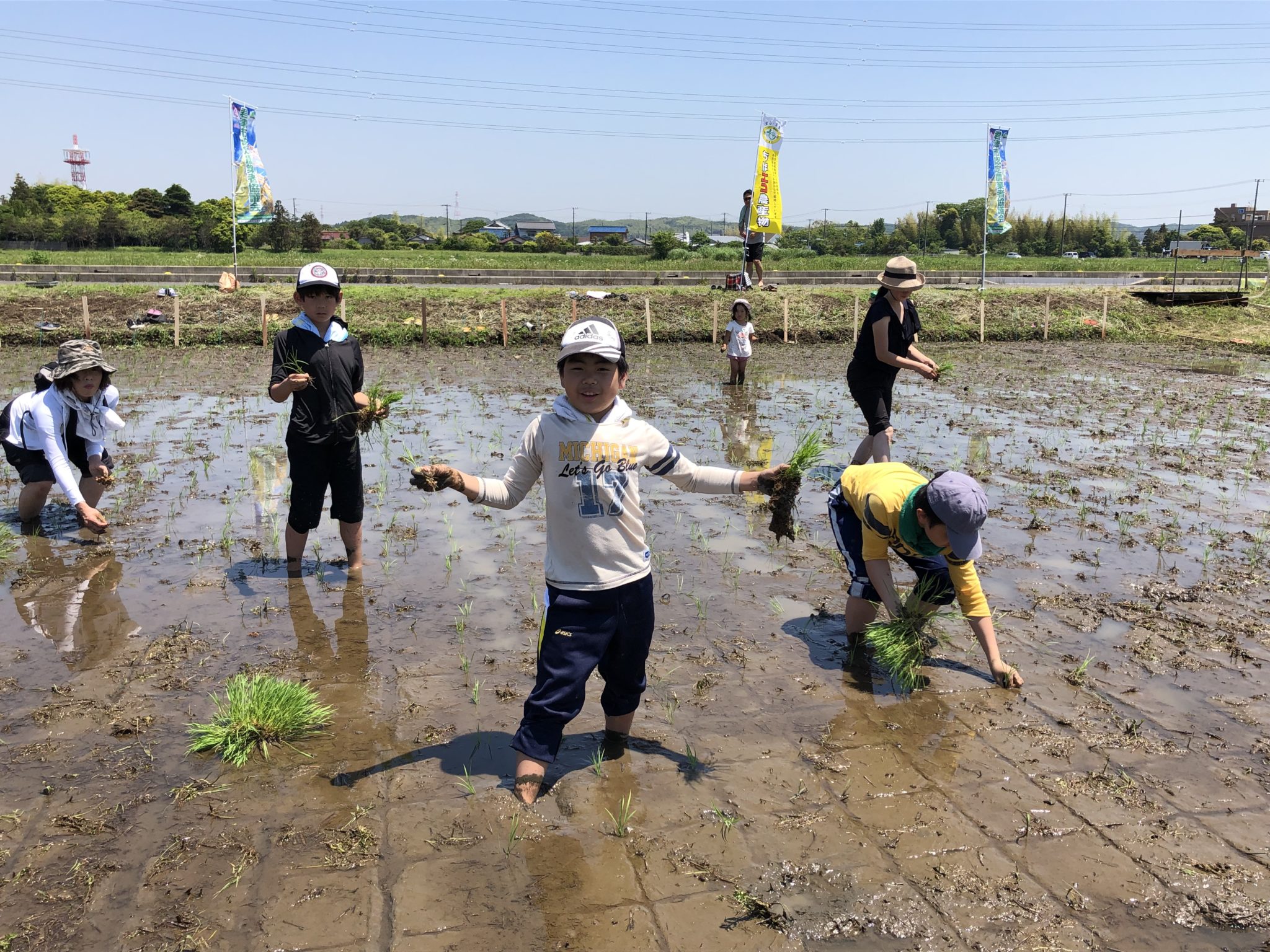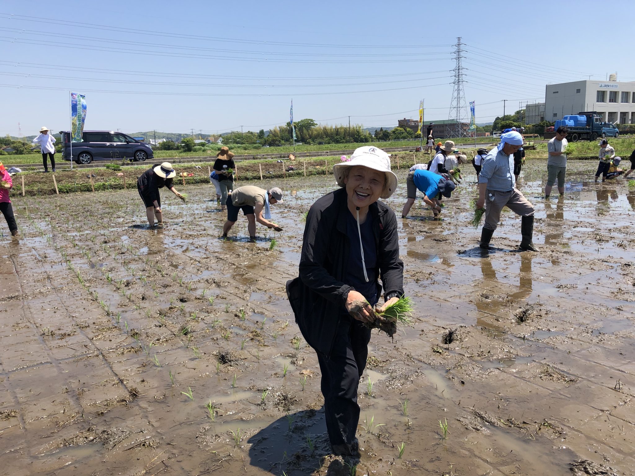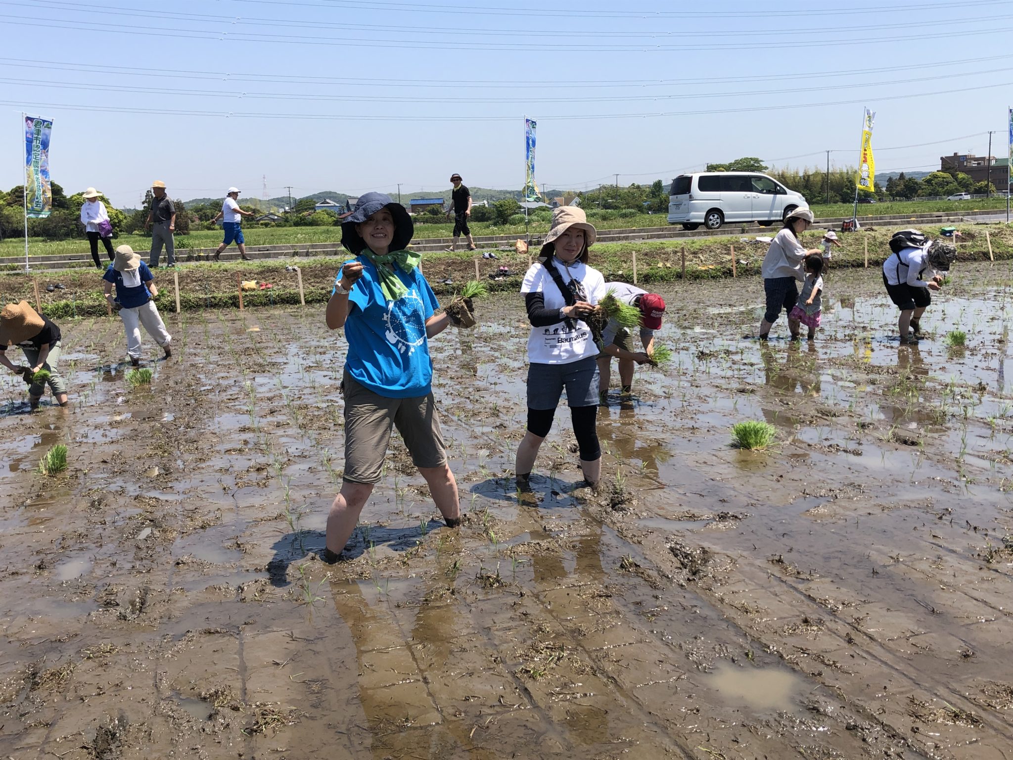 5月25日、おこめのわ主催によります田植え体験の田植え指導、栽培管理のお手伝いに協議会が参加しました。今年で3年目の取り組みとなりましたが、東京から45名の参加者がJAきみつ味楽囲さだもと直売所近くの田んぼに田植えをしに来てくれました。 今日は朝から5月とは思えないぐらいの暑さの中、約1時間の田植えで半分ぐらい手植えをして、半分を機械で植えました。 終了後には味楽囲直売所の弁当を食べて、直売所のソフトクリームを食べて、多くの農産物を買って帰って行きました。お疲れ様でした。