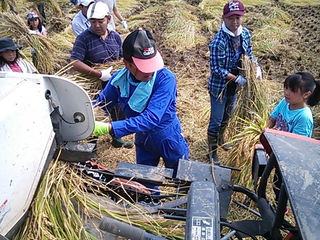 手で刈った稲をコンバインで脱穀します。危険を伴うので、農家の皆さんが行います。