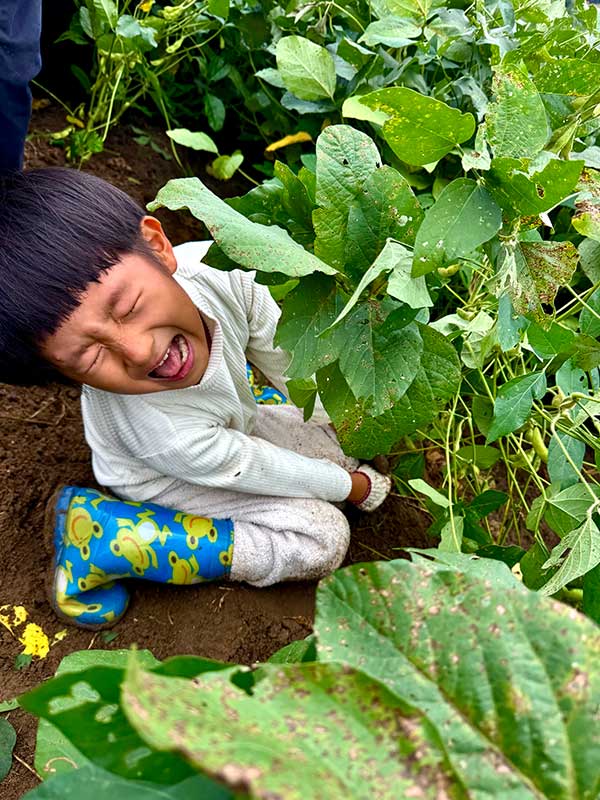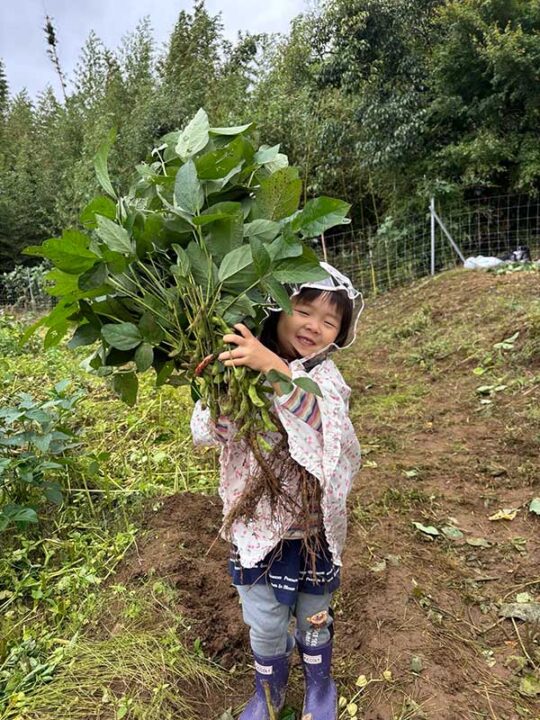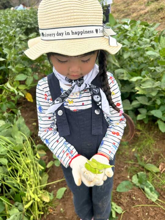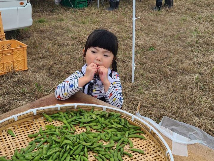 小糸在来の枝豆を食べてから、他の枝豆を食べなくなった3歳の孫。自分で収穫した枝豆を大事に手に乗せ見つめていました。