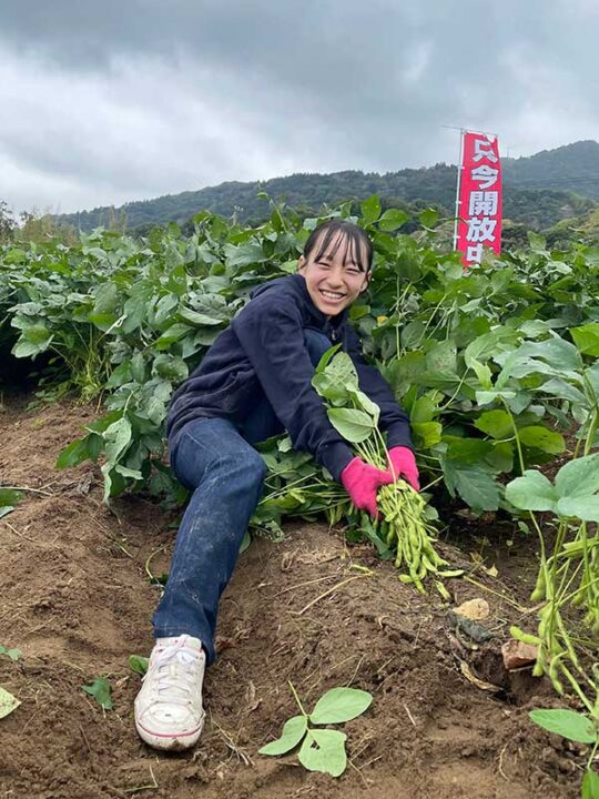 大好きな枝豆を収穫し、思わず満面の笑みが溢れました。枝豆シャキーン!とポーズもバッチリ!