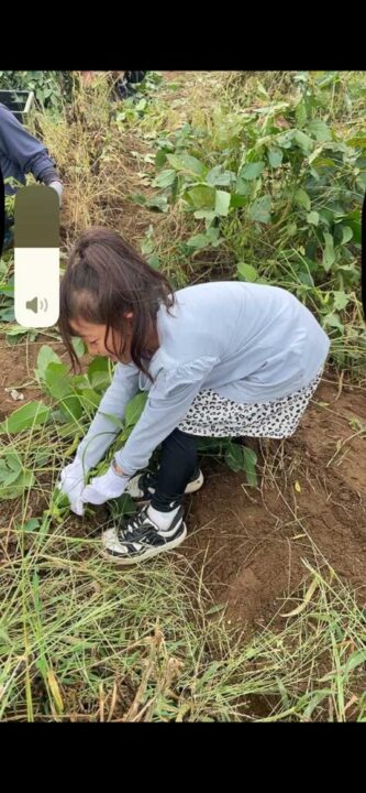 初めての枝豆収穫体験。根っ子が深くて引き抜けない枝豆は抜けそうな所まで土を掘って自分で抜きました。